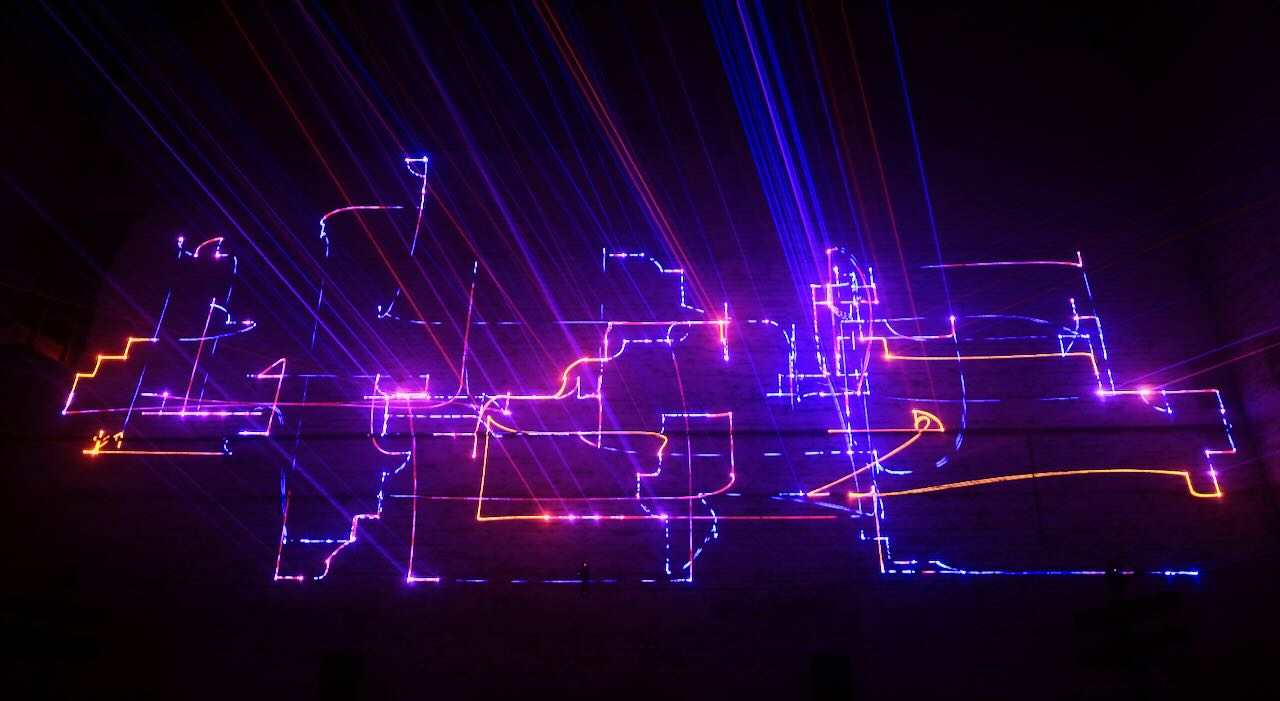 What defines a territory? Where does a line start and end? Who occupies which space and when? How do we negociate and navigate a shared space? Fragile Territories uses four lasers, each contributing to a complex and mutating visual shape, overlapping lines, rigid grids, loose shortcuts, A painting of light, osciallating between static geometry and fluent ephemeral strokes of color.