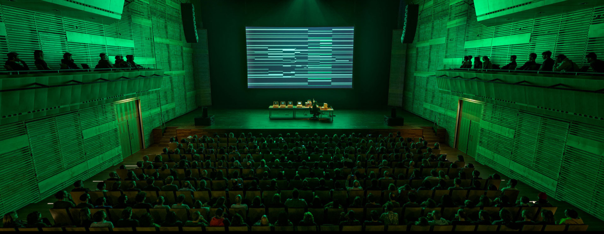 The computers on stage are running custom software developed by the artist and his team. Three of them create sound, one machine is responsible for graphics and one is controlling the others, with their displays facing the audience. A large projection at the back of the stage is mirroring the output from the video graphics computer.