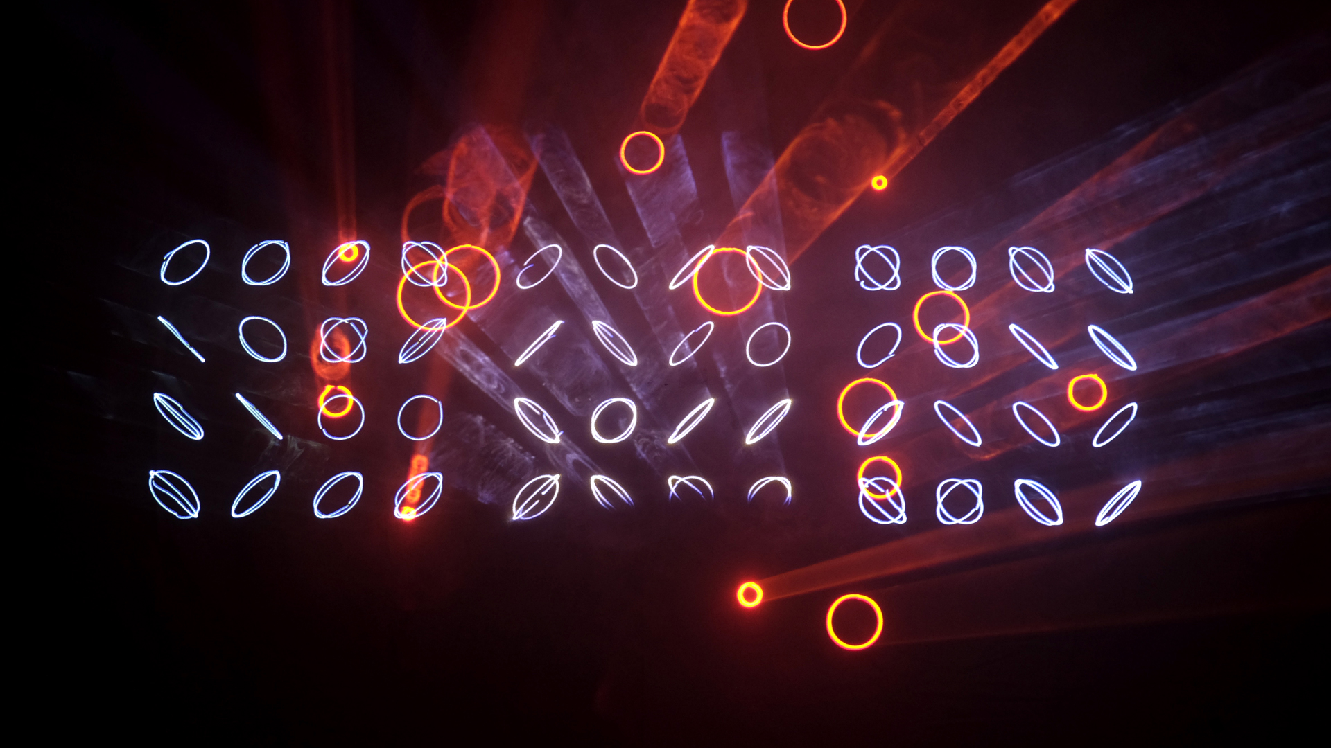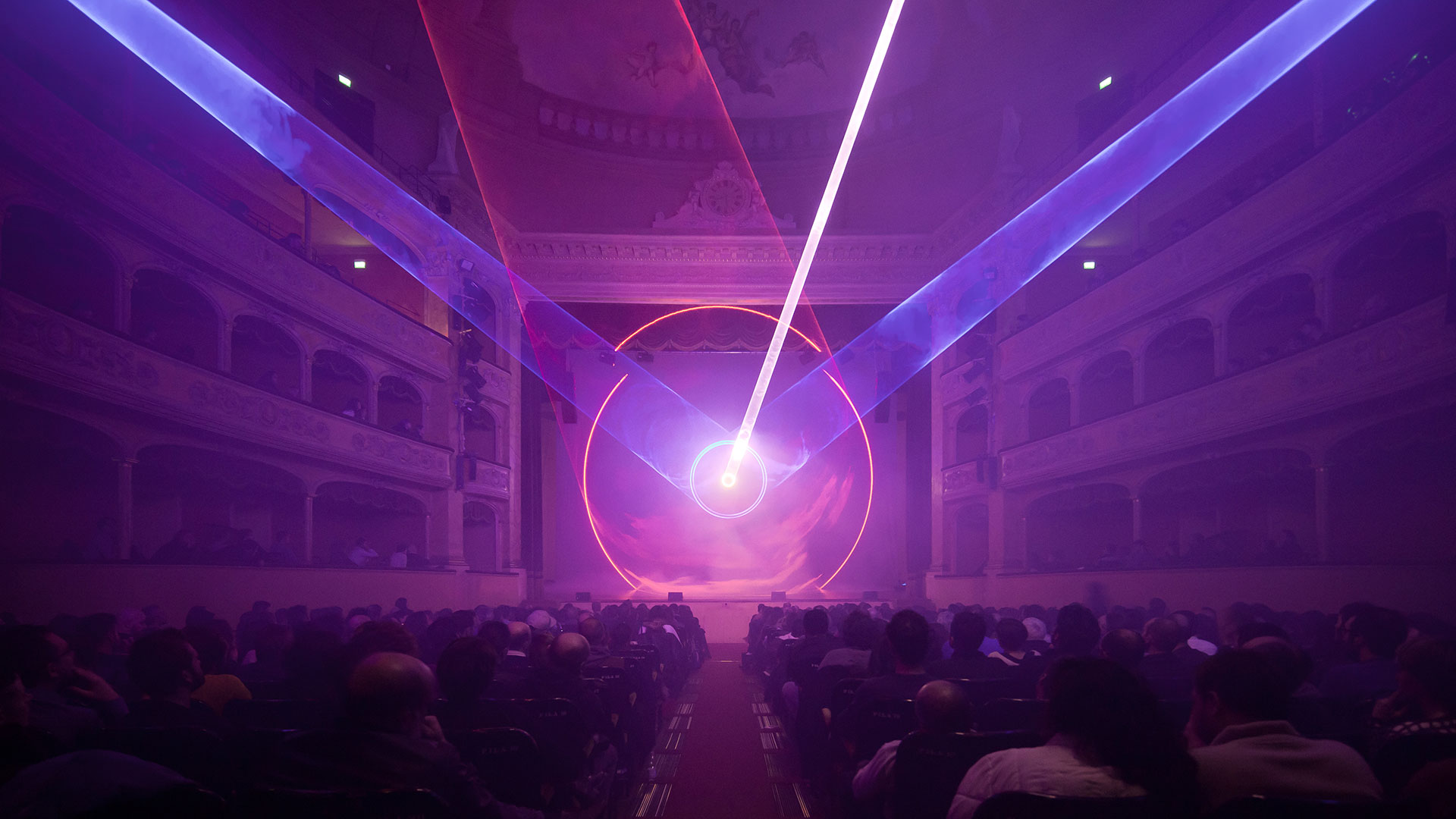 High contrast between total darkness and intense brightness creates 'negative objects' darker than black, the phenomenon of 'persistence of vision' contributes controlled afterimages and a sense of spatiality, which transcends from the projection surface. Synchronised sequences of overlapping moving shapes emitted from multiple lasers in the back of the auditorium are forming a audiovisual experience that oscillates between intimate and overwhelming.