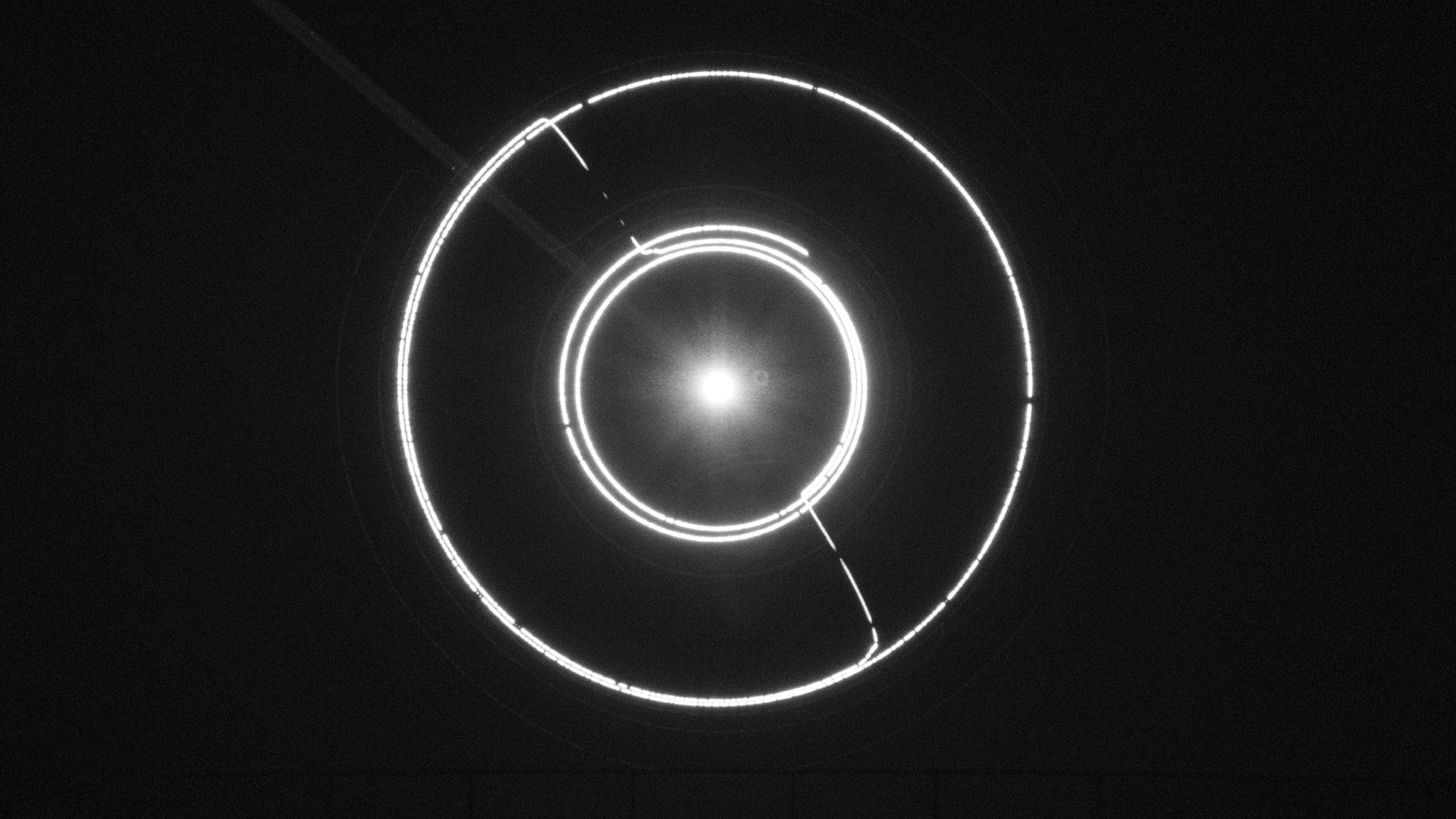 The result is an imaginary audiovisual language of an alien culture, communicating via emerging and disappearing traces of light and sound, futuristic and archaic at the same time.