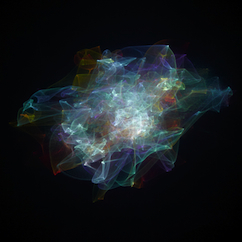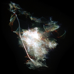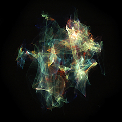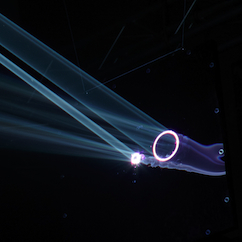 The characteristic visual appearance is the result of interference patterns, waves amplifying and canceling each other out in space, leaving complex traces of light and darkness. It needs a mix of several monochromatic laser sources of various wavelengths (colors) to achive the specific look of the installation. The lasers used ideally provide monochromatic red, yellow, green, cyan and blue.
