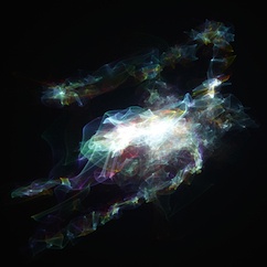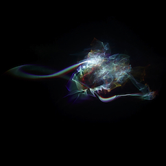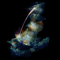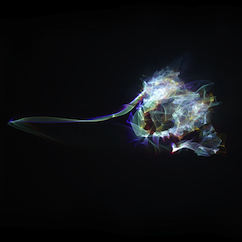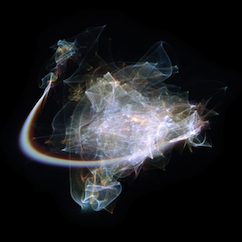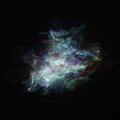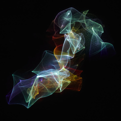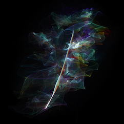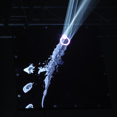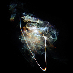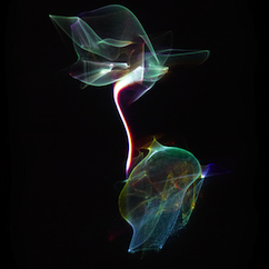 A strong multispectral laser beam points at a black reflective plate of plastic hanging from the ceiling. Most of the light is absorbed and turned into heat. These thermal forces slowly deform the plate's surface and are adding more and more ripples and curvatures to it. A small part is reflected back to a white screen on the opposite side of the room and the heat-induced deformations become visible as large and complex visual patterns.