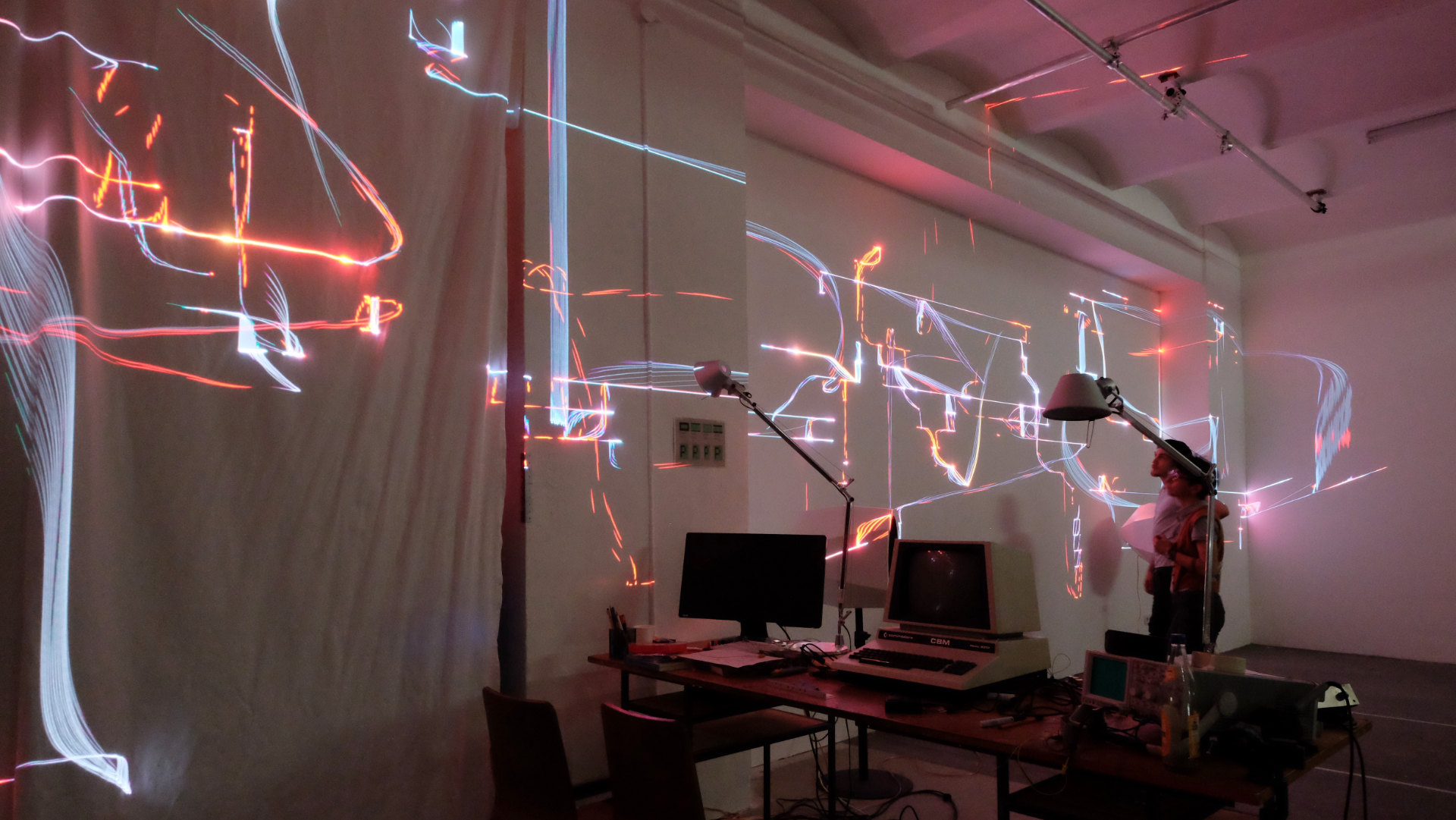 Sometimes the shapes are barely visible, sometimes they explode into extreme brightness. In some sequences the quality of the light is steady, during other times it fluctuates and breaks apart into scintillating particles. The installation is based on a set of stochastic operations whith feedback loops, resulting in slow and chaotic variations that influence the drawing and the sound.