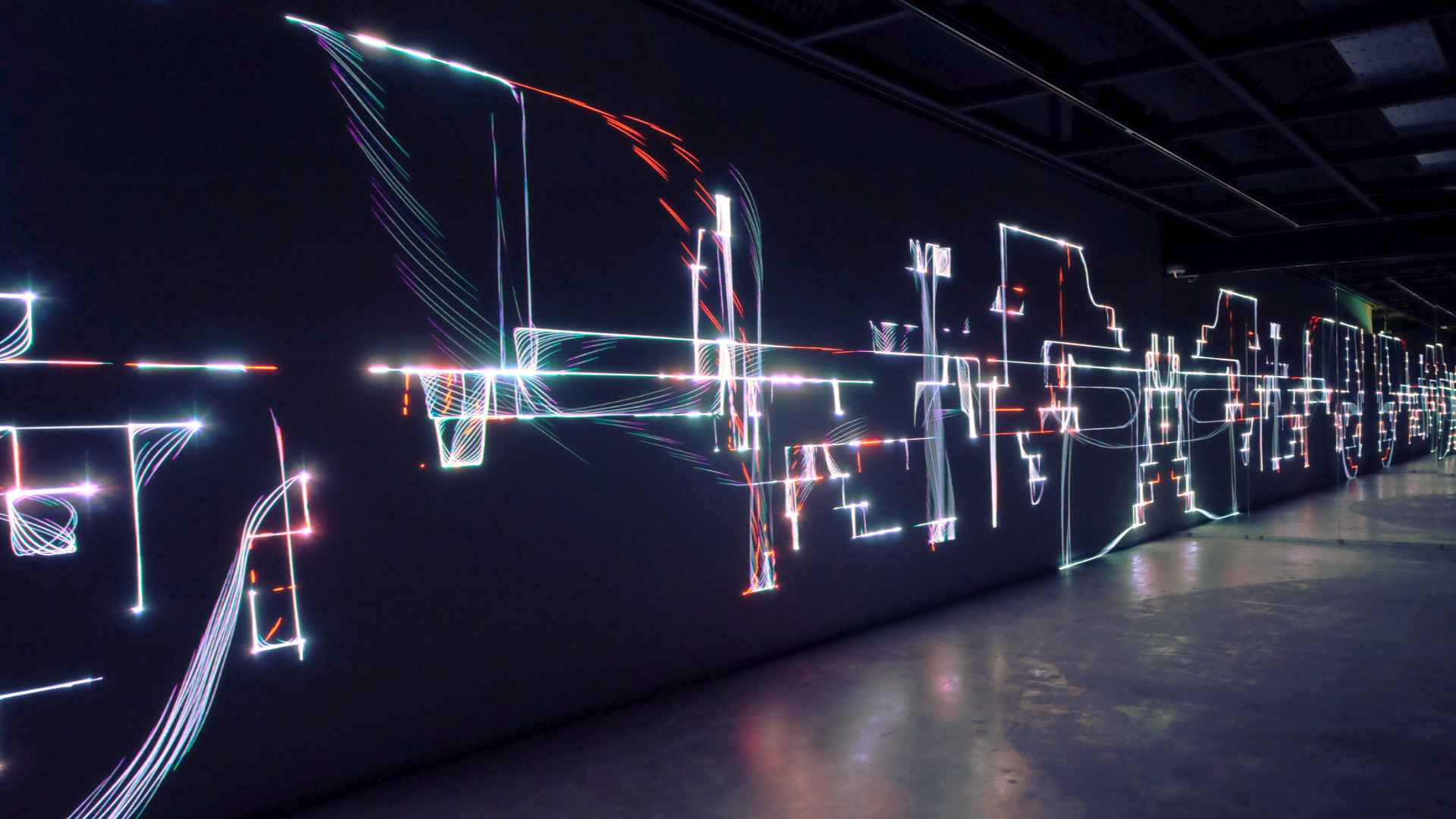 What defines a territory? Where does a line start and end? Who occupies which space and when? How do we negociate and navigate a shared space? Fragile Territories creates a complex and mutating visual shape: overlapping lines, rigid grids, loose shortcuts. A painting of light, osciallating between static geometry and fluent ephemeral strokes of color.