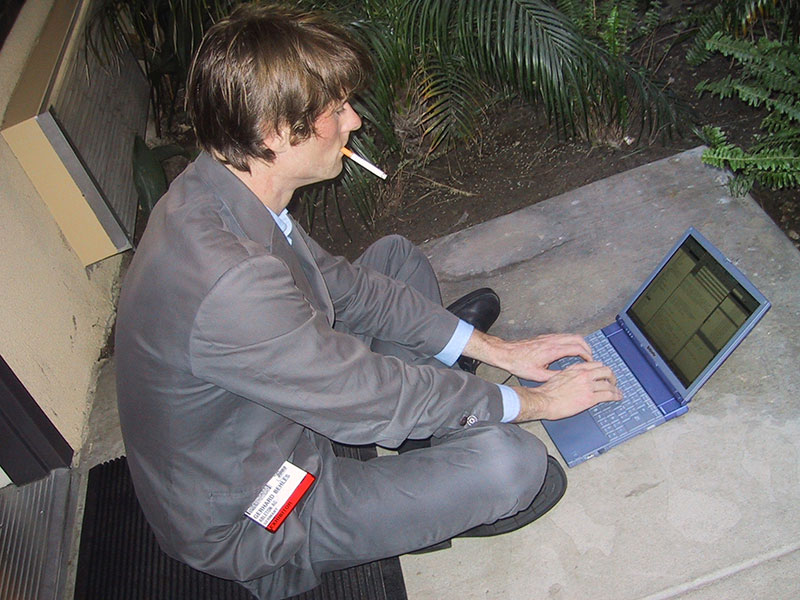 Gerhard Behles in front of motel in Anaheim, LA, during NAMM 2001