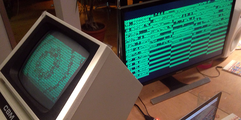 [2016-10-21] We did it! A 36 year old computer mirrored to do full HD video output with 50 frames per second. We knew it should work in theory, but seeing it running for the first time is a different story. What looks very simple in the end is the result of scanning the data and address bus of the CBM computer, then reconstructing the character set and adding the specific blur from the CRT display to make it look right. Ironically this takes 1000 times the CPU power of the old machine. The HDMI out will make it possible to display the graphics nicely with video projectors or large LED screens. (note that the photo shows the first attempt with a shortcut in one of the address lines)