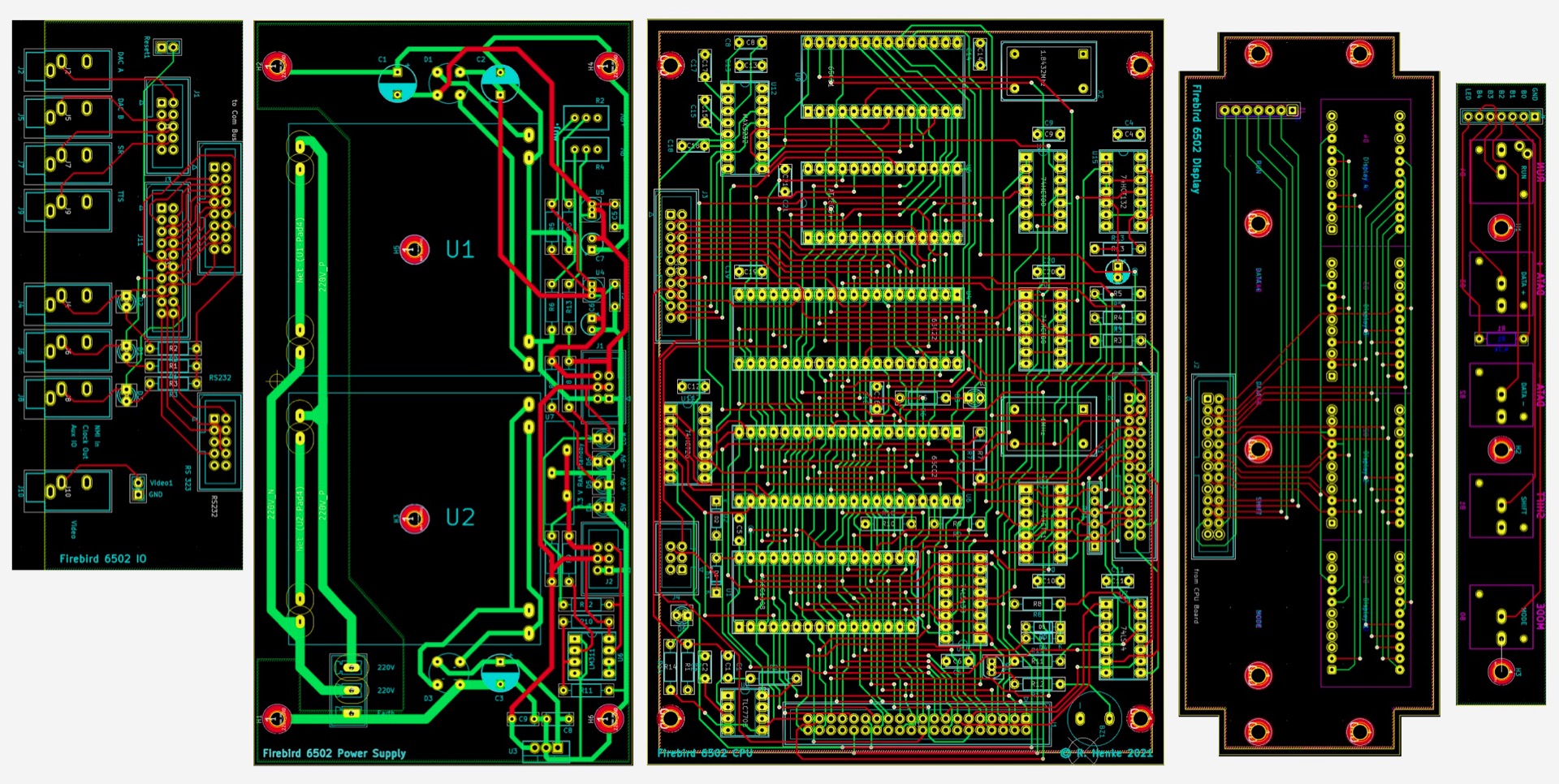 May 9 2021: The six circuit boards which constitute the basic machine, from left to right: IO board, power supply board, CPU board, display board, button board. Not started yet is the development of the DAC / filter / (and potentially speech-synthesis) board, which is not necessary for its primary function as clock generator, but will be done eventually to allow me to develop sound routines for the CBM 8032 AV project on it.