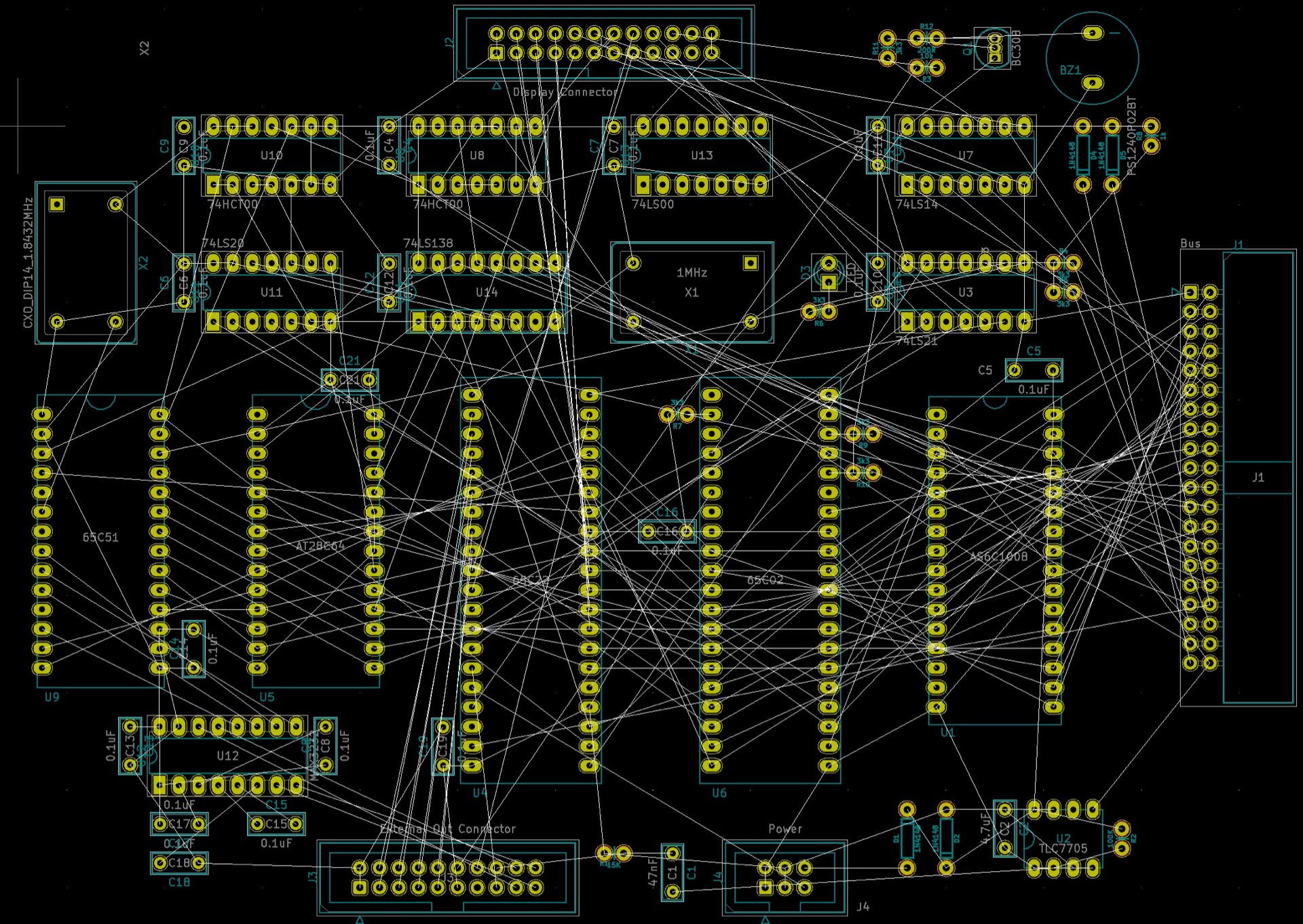 February 4 2021: First draft and tests of firmware using the CBM 8032 almost done: boot loader, display, initialisation of the VIA, ACIA, etc... front panel ordered at Schaeffer. Display panel PCB ordered. All parts for CPU board and power supply board ordered. Start to work on layout for CPU board.