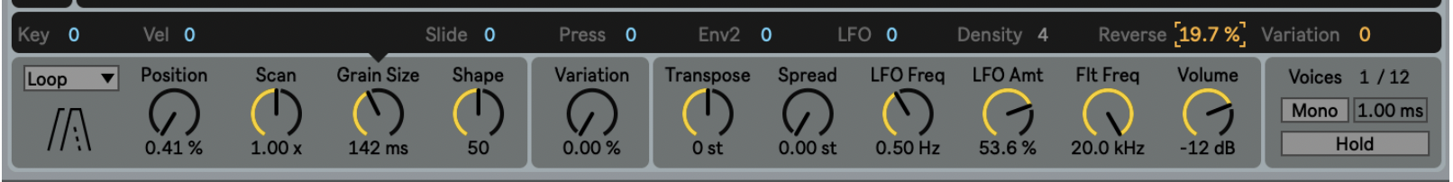 Grain Size can be affected by Key, Velocity, and MPE Slide and Press. It can be modulated with the LFO and the Envelope 2. For typical 'stochastic' granular effects, the size of each grain can also be modulated with a random value, controlled via the Variation modulation parameter, for details see below. In the Loop grain mode, a Reverse parameter defines a chance that a grain is played backwards.