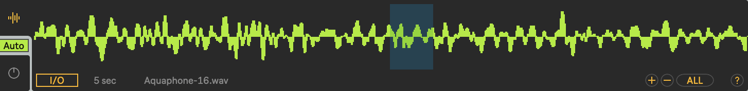 Since the effect of the Grain Shape is calculated at the beginning of each new grain, with longer grains and fast regular modulations e.g. via the LFO, quite complex rhythmical textures can be obtained, depending on the source material. The real-time grain playback visualisation (cyan-coloured moving lines) shows the effect of the grain shape, in the screenshot above it is clearly visible that the grains have a short attack and fades out towards the end.