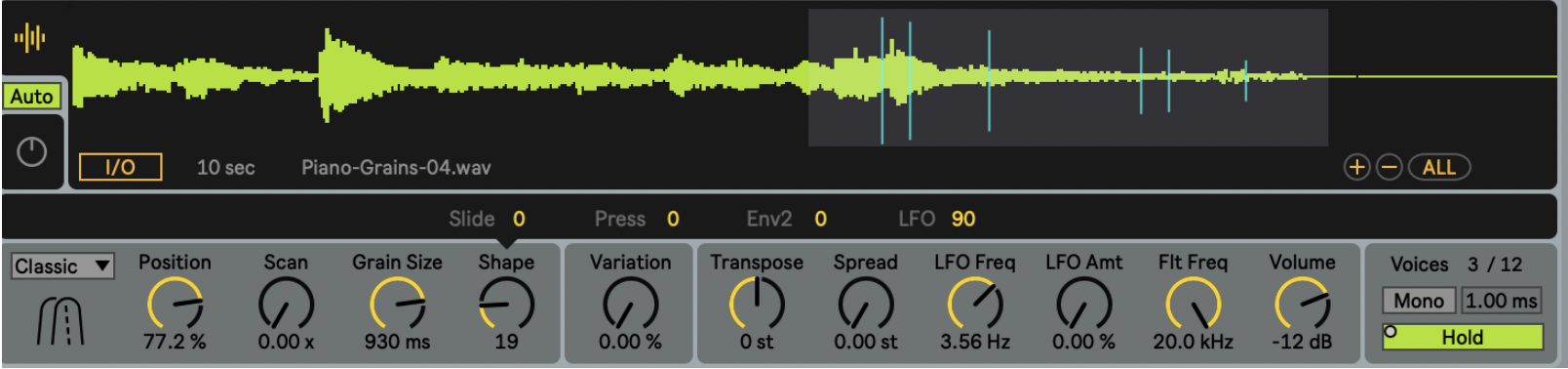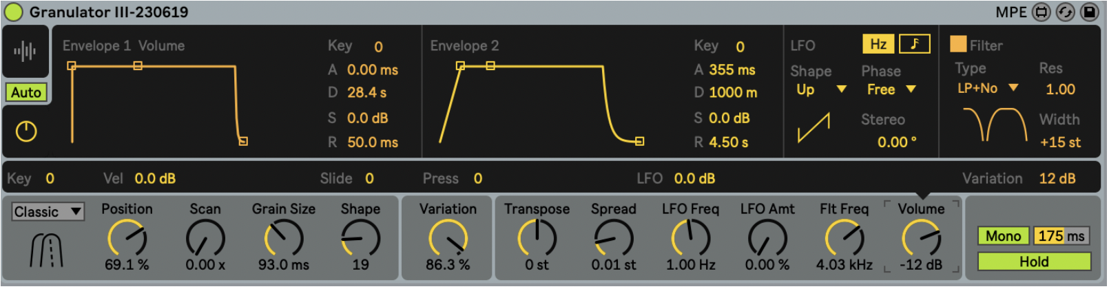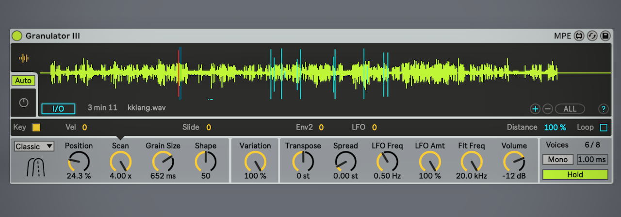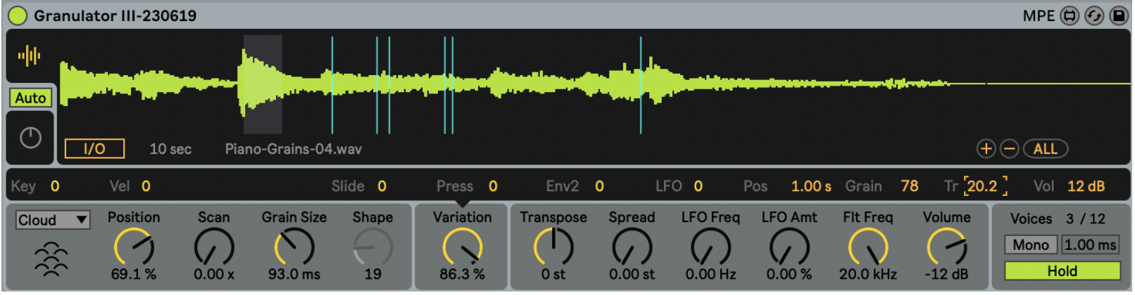 Granulator III has a unique Hold function, similar to those often found in arpeggiators. When active, the last played note(s) are held. This is very helpful for the effortless creation of steady textures or drones using a MIDI Keyboard: play some notes, and then fully focus on adjusting the parameters.