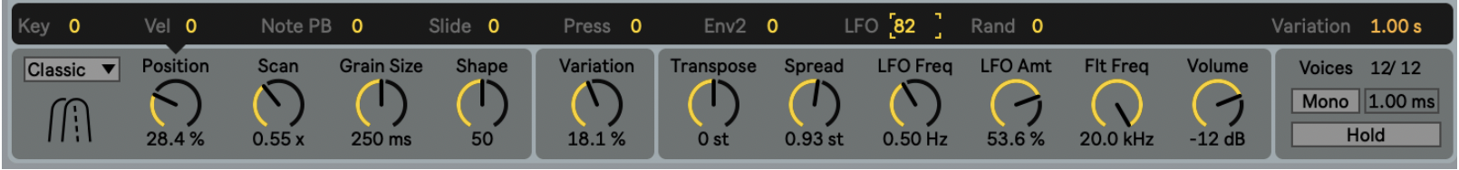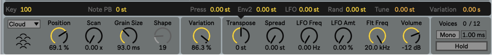 The overall randomness can be controlled via the Variation amount parameter, and the individual effects on the grains can be adjusted with the Position, Grain Size, Transpose, and Volume modulation parameters. The random variation of grain pitch via Transpose is currently only possible in Cloud mode, and negative values do not have an effect. This might change in a future update.