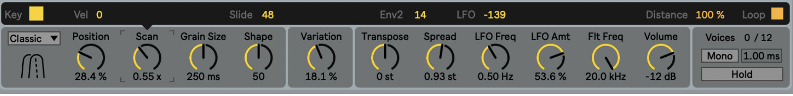 The Position parameter defines which section of the source sample is played back in each grain. Since it is scaled in % it stays at its relative position even when a new sample is loaded or captured. Position can be modified in various ways, it can move from its start point to an endpoint, see the Scan parameter for details or it can have a random variation for each grain using the Variations parameter.