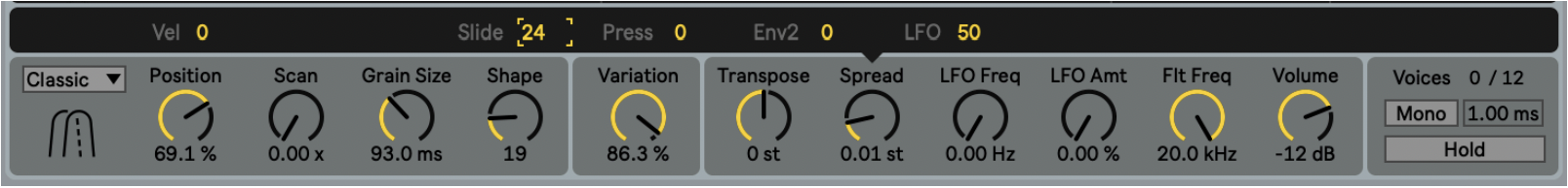 When you intend to work with Granulator with tuned material, and you want that MPE pitch bend data is received and that Granulator responds correctly to the Live 12 tuning systems, make sure that Note Pitch Bend in the Transpose section is set to 48st.