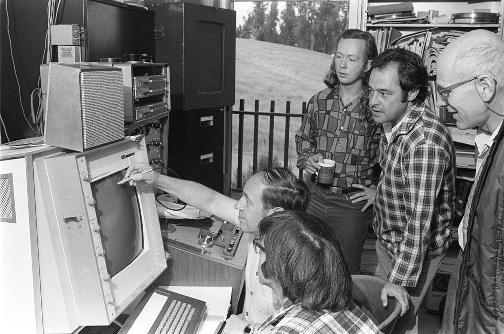 photo: In 1975 Pierre Boulez brought an IRCAM team to CCRMA for a two-week course in computer music. Seated by the computer (left to right) Pierre Boulez and Steve Martin (graduate student); standing (left to right) James (Andy) Moorer, John Chowning, Max Mathews. Photo by José Mercato.