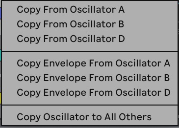 Each Oscillator has a context (right click) menu that allows to copy settings from/to the other oscillators. It is located above the colored enable switch of each oscillator ('A', 'B','C','D')
