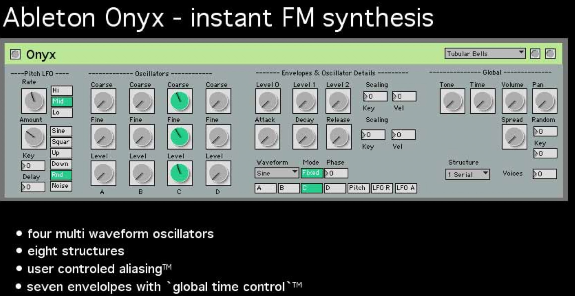 In 2004 I started to prototype Ableton's first synth and called it 'Onyx'. The goal was simple: It should not be heavy on CPU (which ruled out good sounding analog modelling), it should offer a huge sonic palette, and it should be fun to program. I took a lot of inspiration from my DX27 as a starting point.