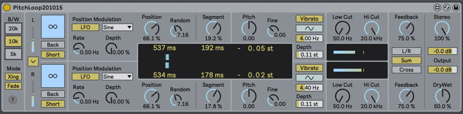 Pitch can be quantised to semitones, and is displayed also in semitones and not fractional ratios. Feedback offers cross-feedback and merging, independent of bandwidth settings.